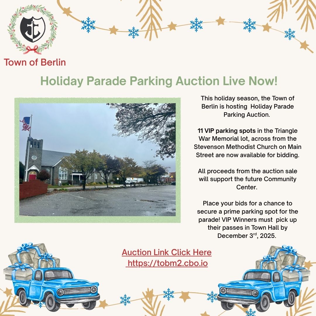 Berlin, MD – The Town of Berlin is conducting its second auction this year to support the future Community Center. Many residents and visitors have asked for ways to secure parking in the Town of Berlin on one of the busiest nights of the year, the first Thursday in December, during the annual Christmas Parade, and have suggested they would even be willing to pay for a spot closer to the parade. Building on the great success of the Town’s Street Sign Auction over the summer —which raised over $10,000 for the Community Center through the sale via auction of old Street Signs—the Mayor’s Office has launched a Parade Parking Auction for just eleven parking spots facing Main Street in the triangle War Memorial Parking lot, across the street from Stevenson Methodist Church, steps from the 2025 Parade Stage.